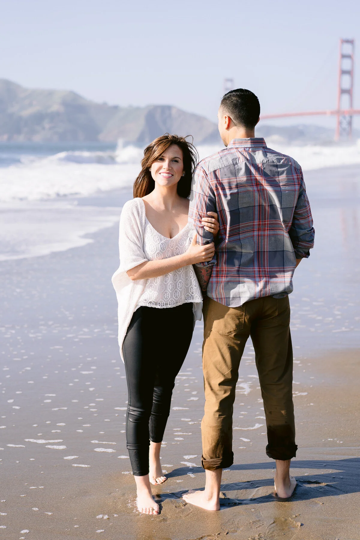 Stephanie and Danny are a wonderful and fun couple and were a dream to photograph. They were down for any pose we threw at them and they did not stop smiling and laughing throughout the entire engagement session. We began the engagement session with them walking hand in hand on the beach close to the crashing waves with the beautiful Golden Gate Bridge as a backdrop. At one point, a wave sneaked up and got them wet, but they were having so much fun, they did’t mind at all. They just took off their shoes and rolled up their pants and kept going!