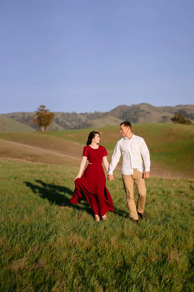Coree and Ryan popped some champagne and enjoyed it together in adorable Mr. and Mrs. champagne flutes. Then they took a stroll among the rolling hills of the park. Their engagement session was in March, so the hills still had a lot of green in them, making for a gorgeous landscape. Of course, the golden hills of summer have their own unique beauty as well and Montgomery Hill Park would make an excellent engagement session location choice in San Jose any time of the year.
